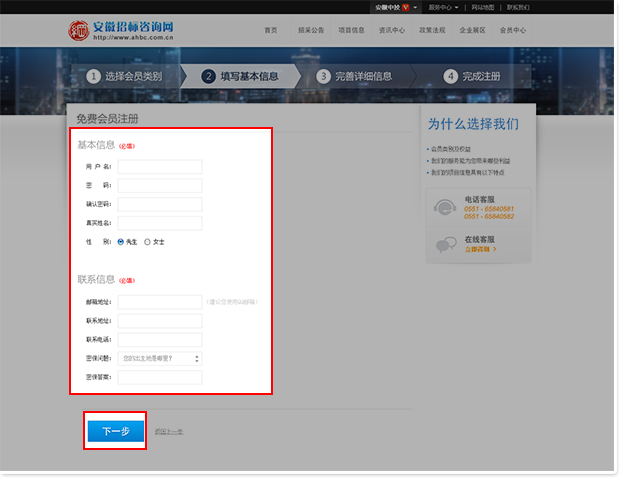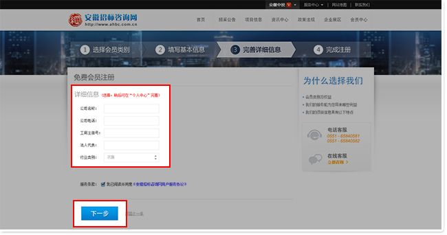 第四步:完善詳細(xì)資料,也可稍后在“個(gè)人中心”完善。閱讀并同意服務(wù)條款后選擇“我接受 安徽招標(biāo)咨詢網(wǎng)服務(wù)協(xié)議 ”,然后點(diǎn)擊“下一步”。