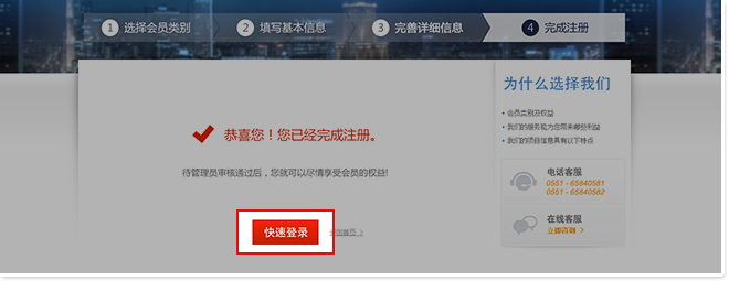 第五步:在注冊(cè)資料填寫正確的前提下,彈出注冊(cè)成功的頁(yè)面。您就成為安徽招標(biāo)咨詢網(wǎng)的免費(fèi)會(huì)員了!在這個(gè)頁(yè)面里您可以快速登錄。